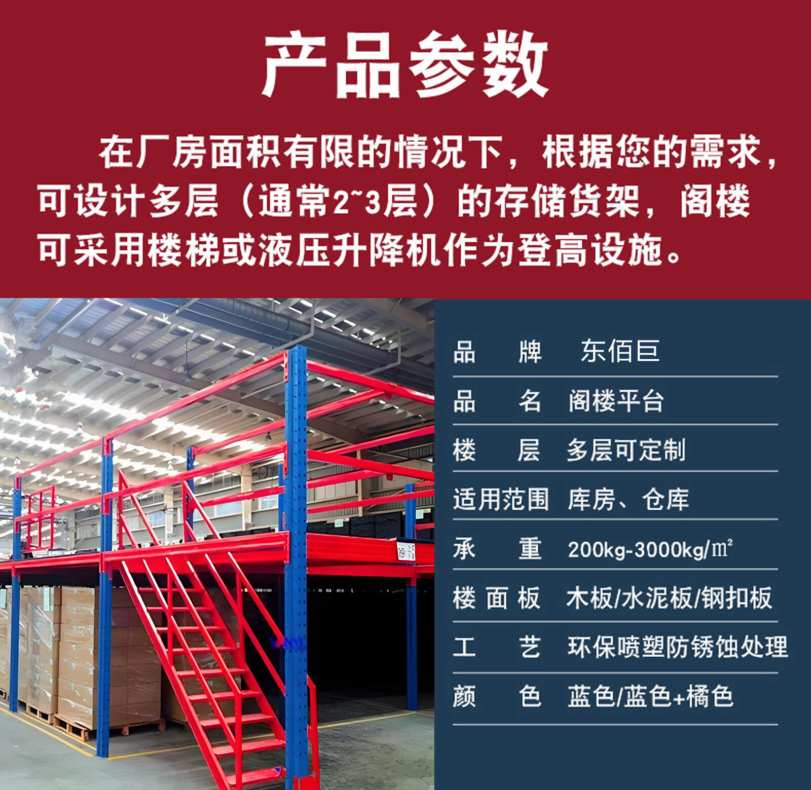 产品参数:在厂房面积有限的情况下,根据您的需求可设计多层(通常2~3层)的存储货架,阁楼可采用楼梯或液压升降机作为登高设施。