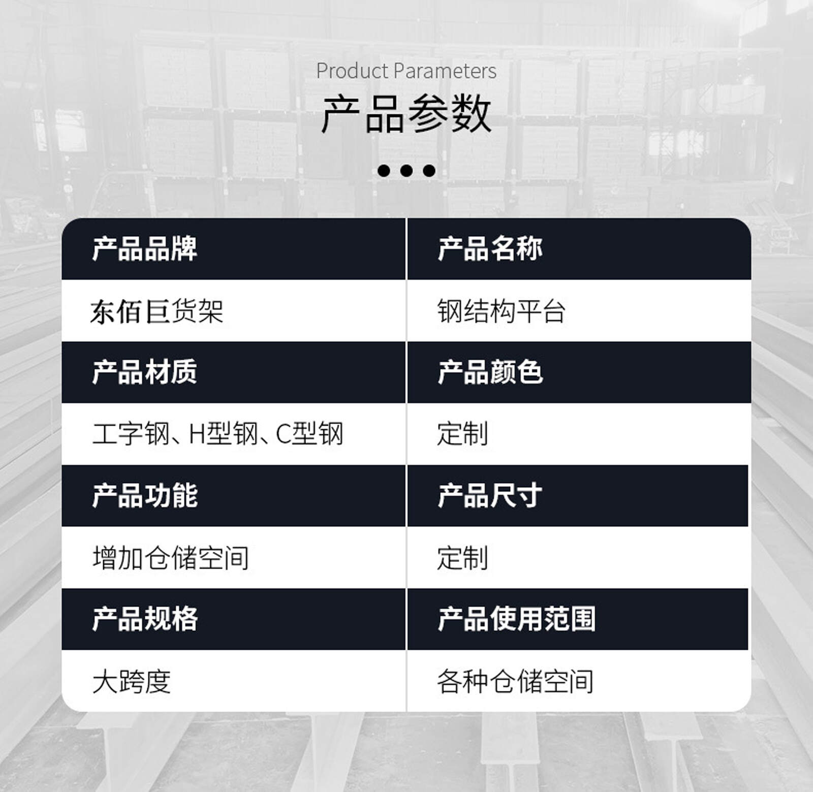 产品参数:东佰巨阁楼货架,钢结构平台,工字钢、H型钢、C型钢,可根据客户需求定制,增加仓储空间,合各种仓库使用。