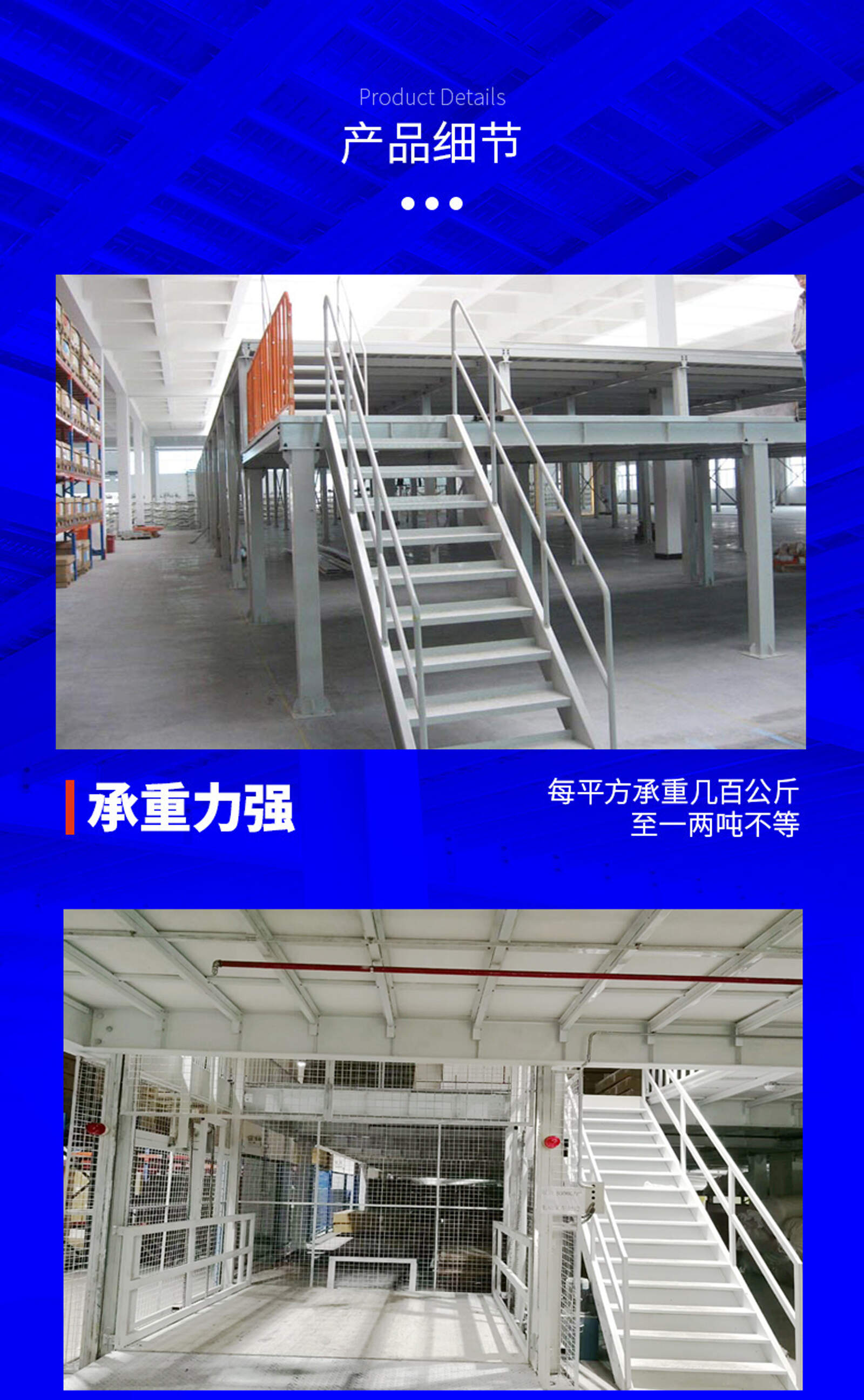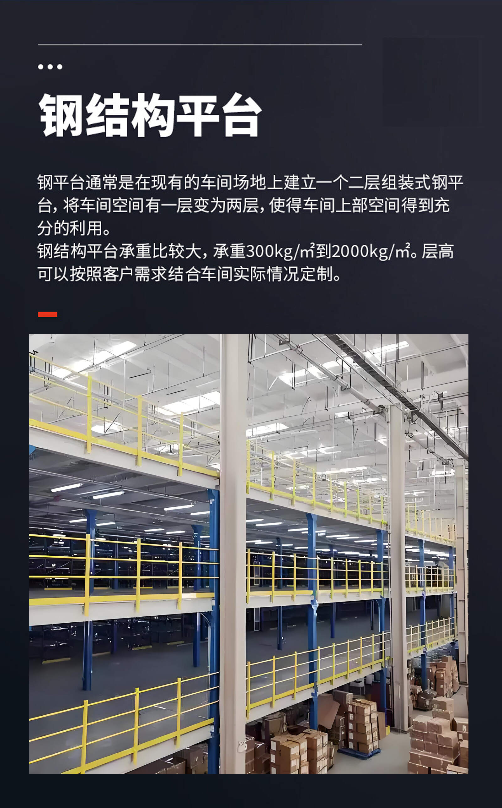 钢平台通常是在现有的车间场地上建立一个二层组装式钢平台,将车间空间有一层变为两层,使得车间上部空间得到充分的利用。钢结构平台承重比较大,承重300kg/到2000kg/