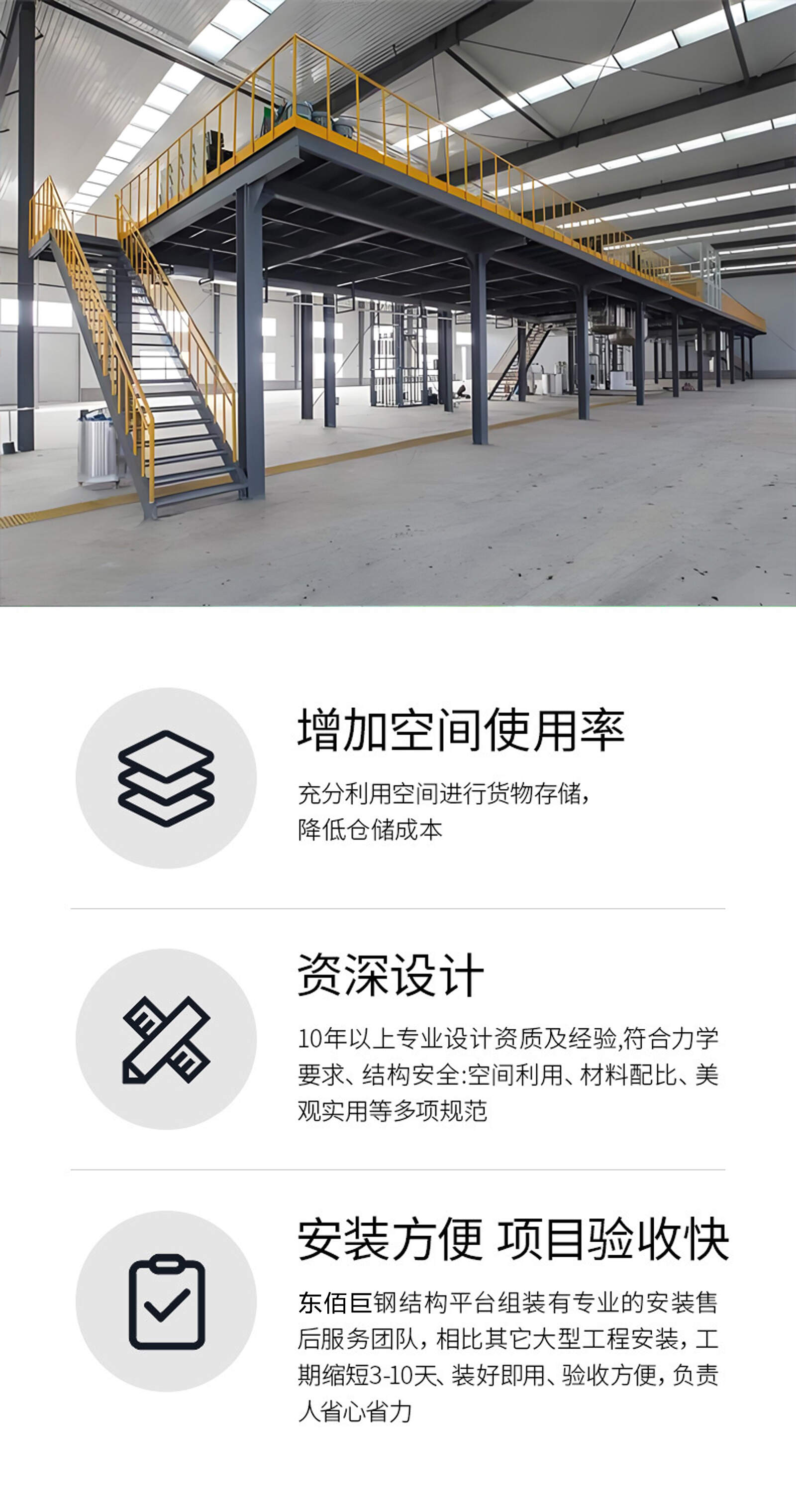 安装方便 项目验收快 东佰巨钢结构平台组装有专业的安装售后服务团队,相比其它大型工程安装,工期缩短3-10天、装好即用、验收方便,负责人省心省力