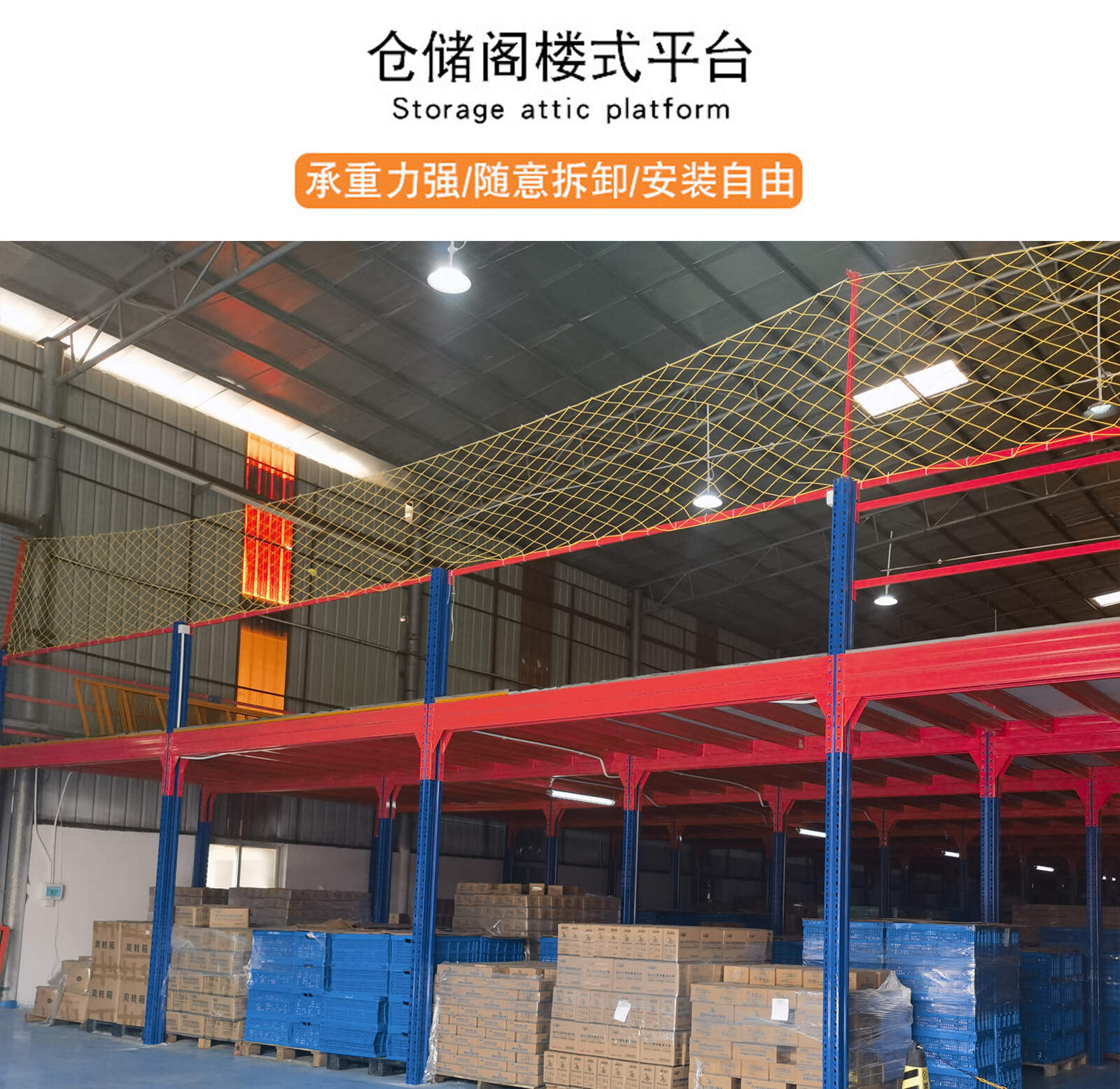 阁楼货架平台:可载200-1000kg/平方(均载)的货物,可具备价格低,方便拆装,安装方便等优势。