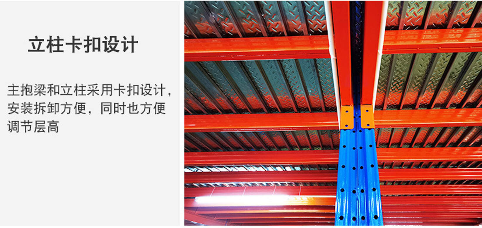 | 立柱卡扣设计 | 主抱梁和立柱采用卡扣设计安装拆卸方便,同时也方便调节层高 |